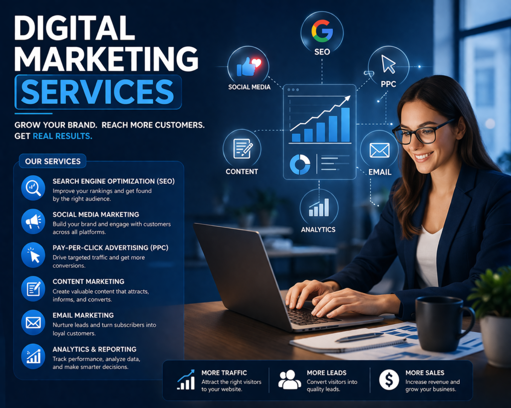We provide smart and result-driven digital marketing solutions designed to grow your business online. Our approach combines SEO, paid advertising, social media marketing, content creation, and data analytics to attract the right audience and convert them into customers. We don’t just focus on traffic—we focus on generating quality leads, increasing conversions, and maximizing your return on investment (ROI). From building strong brand awareness to creating high-converting sales funnels, our strategies are customized according to your business goals. With continuous optimization, performance tracking, and innovative marketing techniques, we ensure your business stays ahead of the competition and achieves long-term success in the digital world.